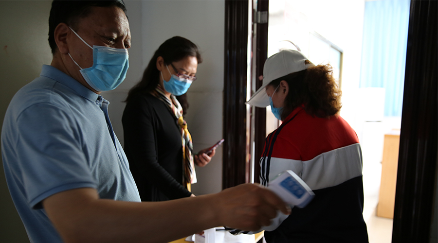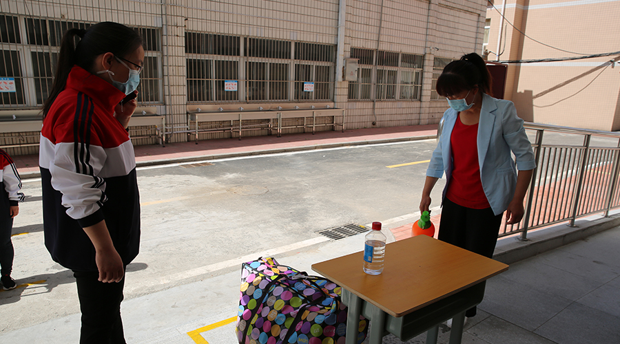 在入校演练活动中,由各班主任扮演的“员工们”按照间隔要求,排队等待体温测量。负责测量体温的老师们熟练地操作体温枪,发现有发热员工,马上上报卫生健康老师,并在做好有效防护的情况下,引导发热疑似人员前往隔离室。消杀组成员立即对相关区域进行消杀。