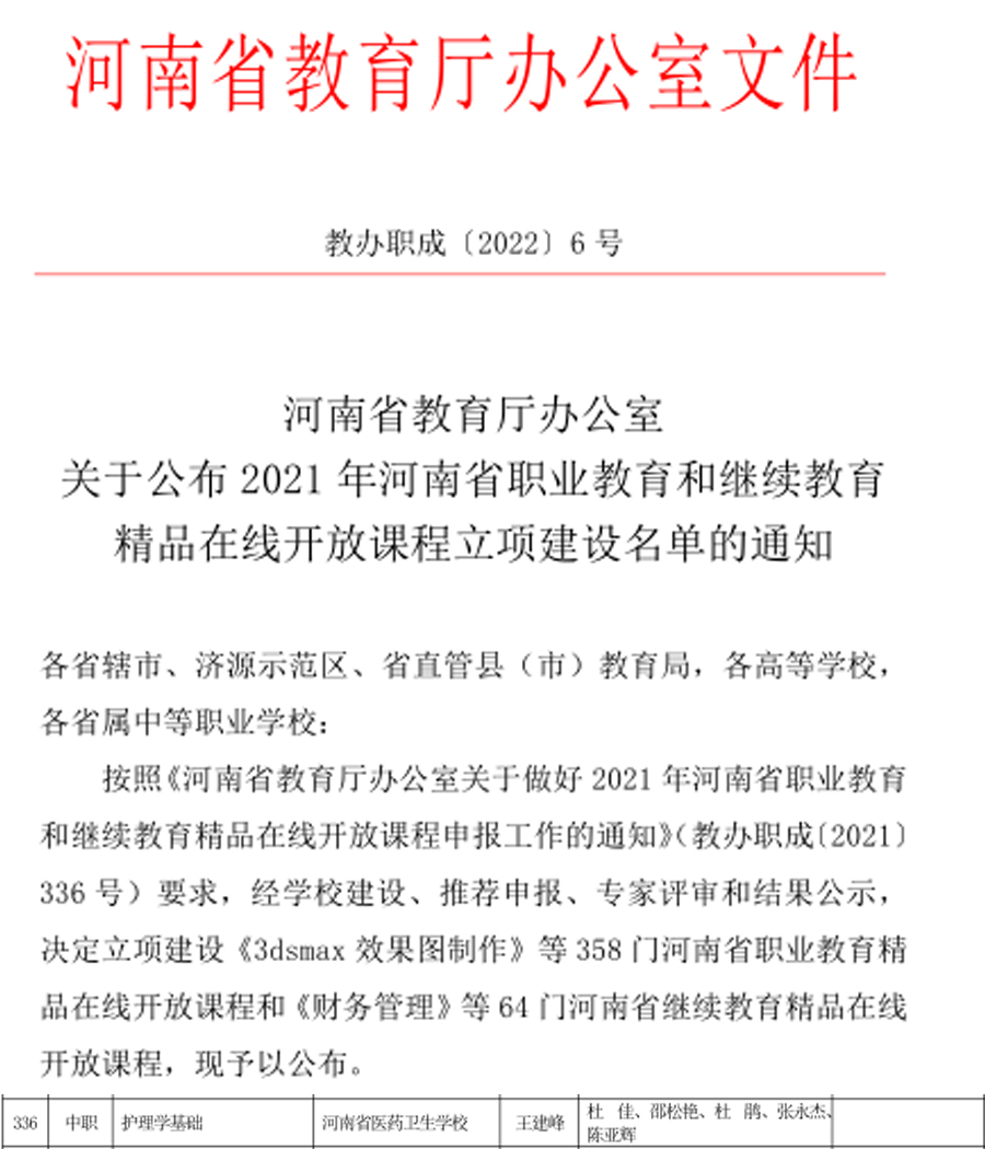 公司《护理学基础》在线开放课程正式立项 近日,从河南省教育厅传来喜讯。在其公布的2021年河南省职业教育和继续教育精品在线开放课程立项建设名单中,公司王建峰主持,杜 佳、邵松艳、杜 鹃、张永杰、陈亚辉等...